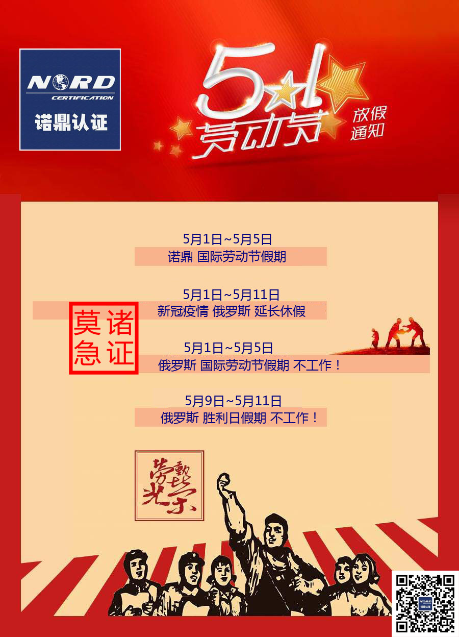 请注意,5月1日-5月5日是国际劳动节假期,5月9日-5月11日是俄罗斯胜利日假期,这两个法定假期期间会暂停居家办公。请新老客户安排好认证计划,并预祝诸位假期愉快,阖家欢乐康健!
