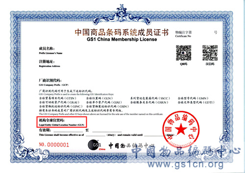 申请成功后,商品条码系统成员证书上可查询GLN号码。样例如下: